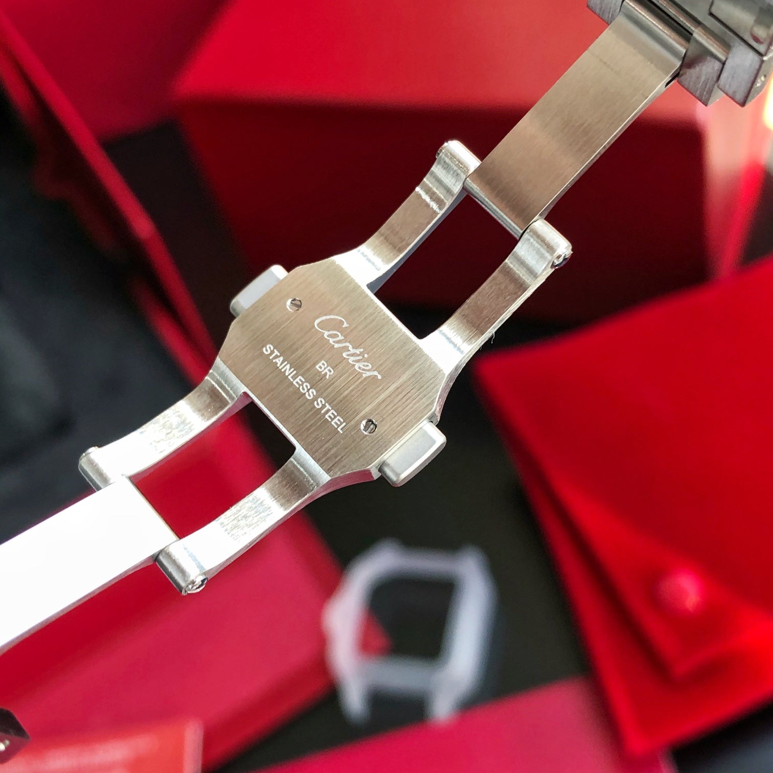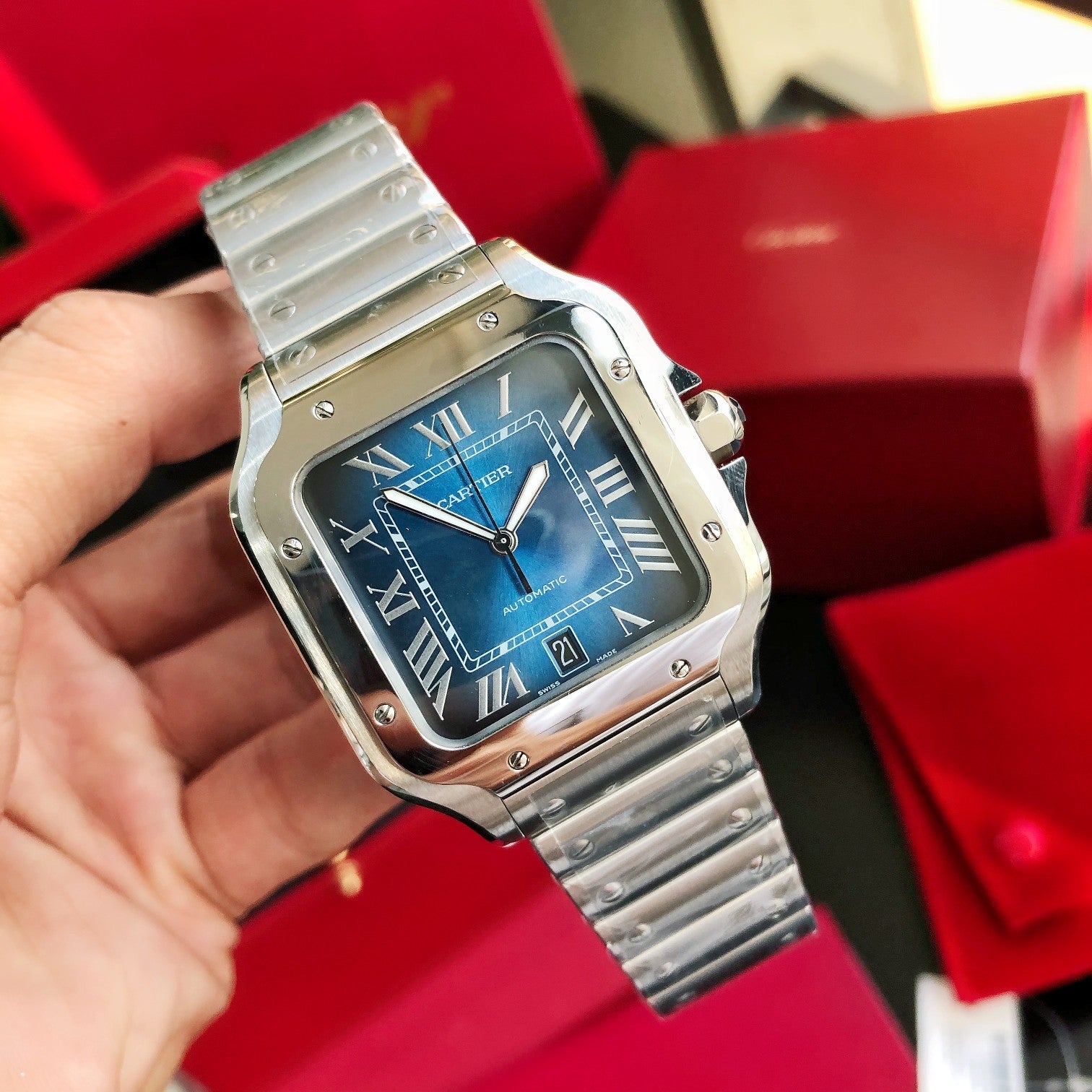 The iconic Cartier Santos Large with a sleek blue dial – a perfect blend of sporty elegance and timeless luxury. This automatic timepiece features the robust 1847 MC movement, a bold square case, and polished Roman numeral hour markers. Comes with the original Cartier box, booklets, and SmartLink bracelet adjustment system.