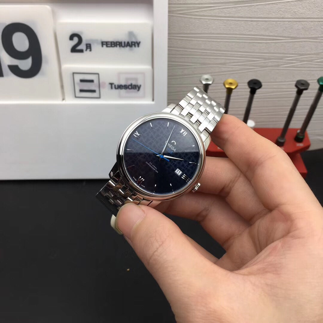 Omega De Ville Prestige with sleek dark patterned dial and stainless steel bracelet. A formal yet sophisticated timepiece. Ships with original box and full documentation.