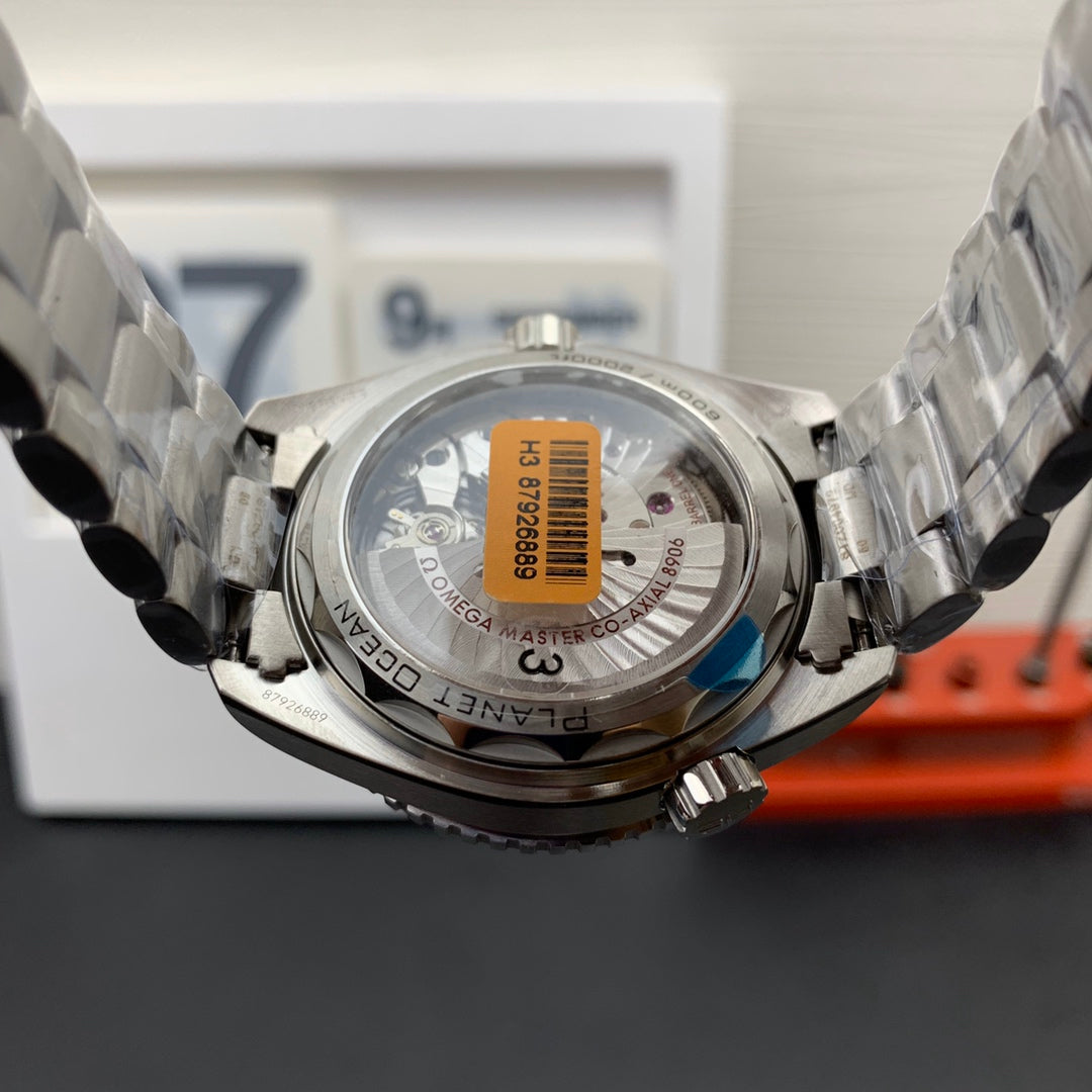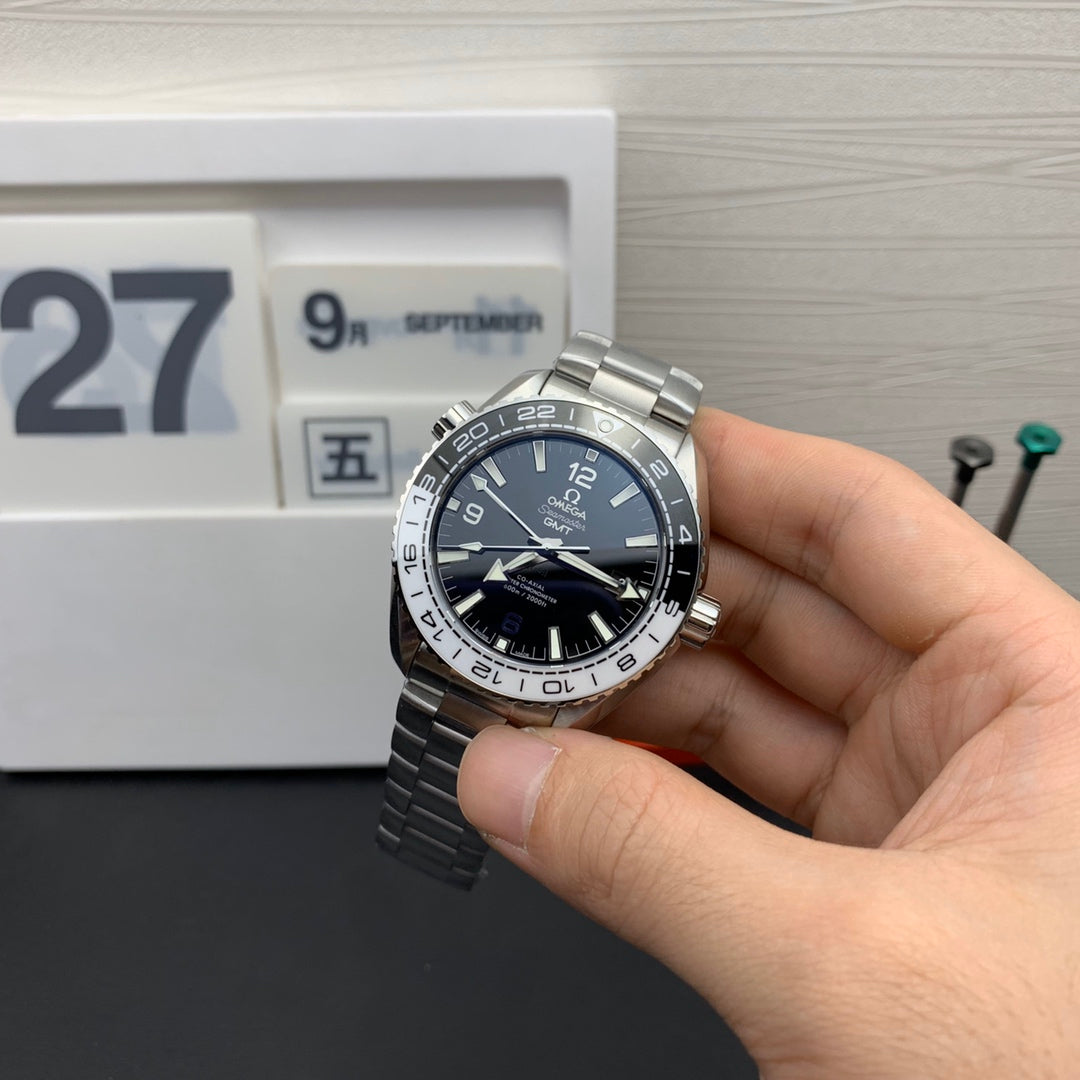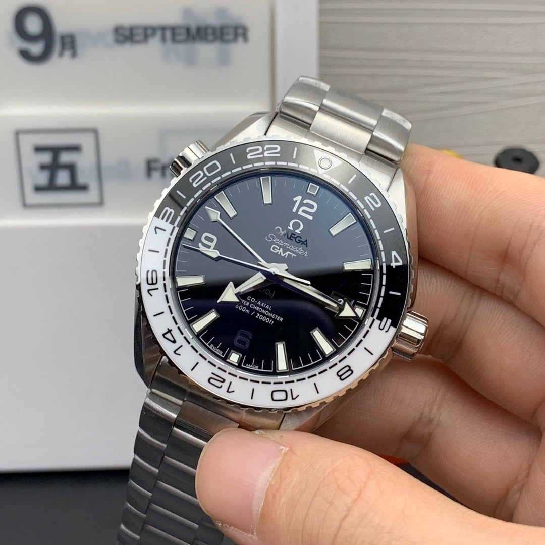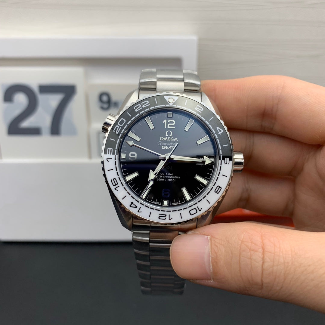 This Omega Seamaster Planet Ocean GMT features a bold black dial with white ceramic bezel, Co-Axial movement, and 600m water resistance. Ideal for globetrotters and divers. Includes original box, warranty card, and manuals.